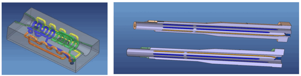 AddUp and ZAHORANSKY first carried out a simulation-based evaluation to determine the potential performance gains. These early studies confirmed that a conformal cooling concept could significantly reduce cooling time and improve thermal stability. Based on these results, a fully three-dimensional cooling design was developed, incorporating a four-path parallel cooling circuit to ensure balanced flow and consistent temperature behavior inside the tool.